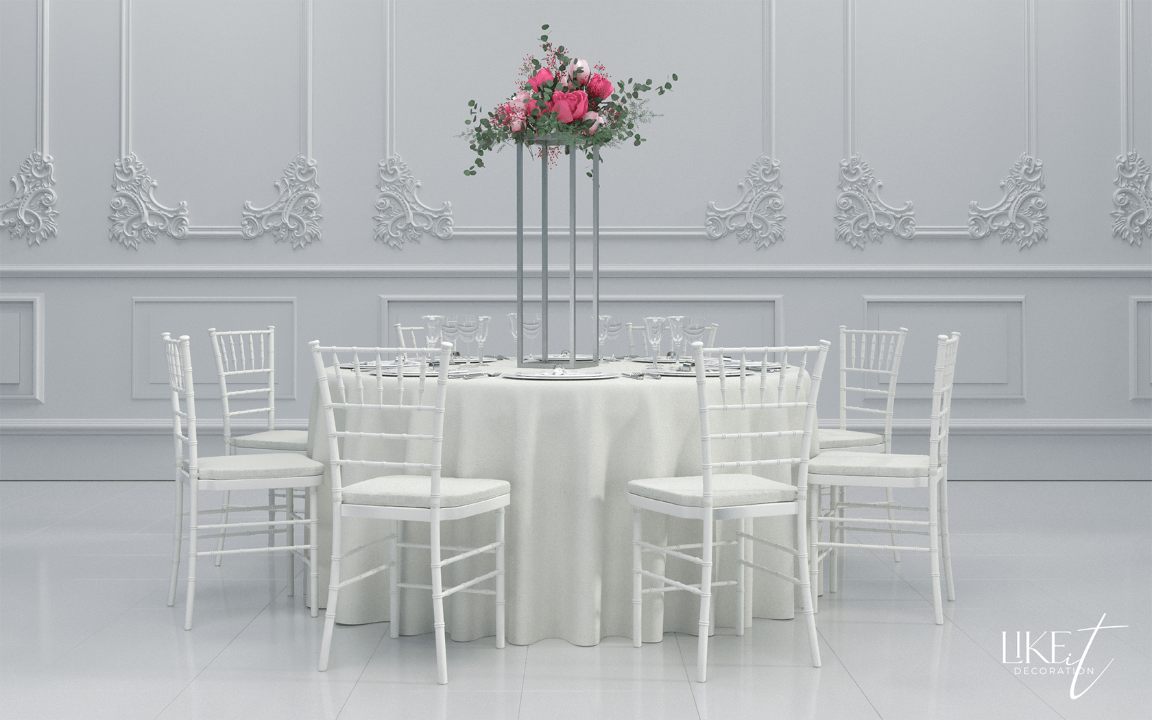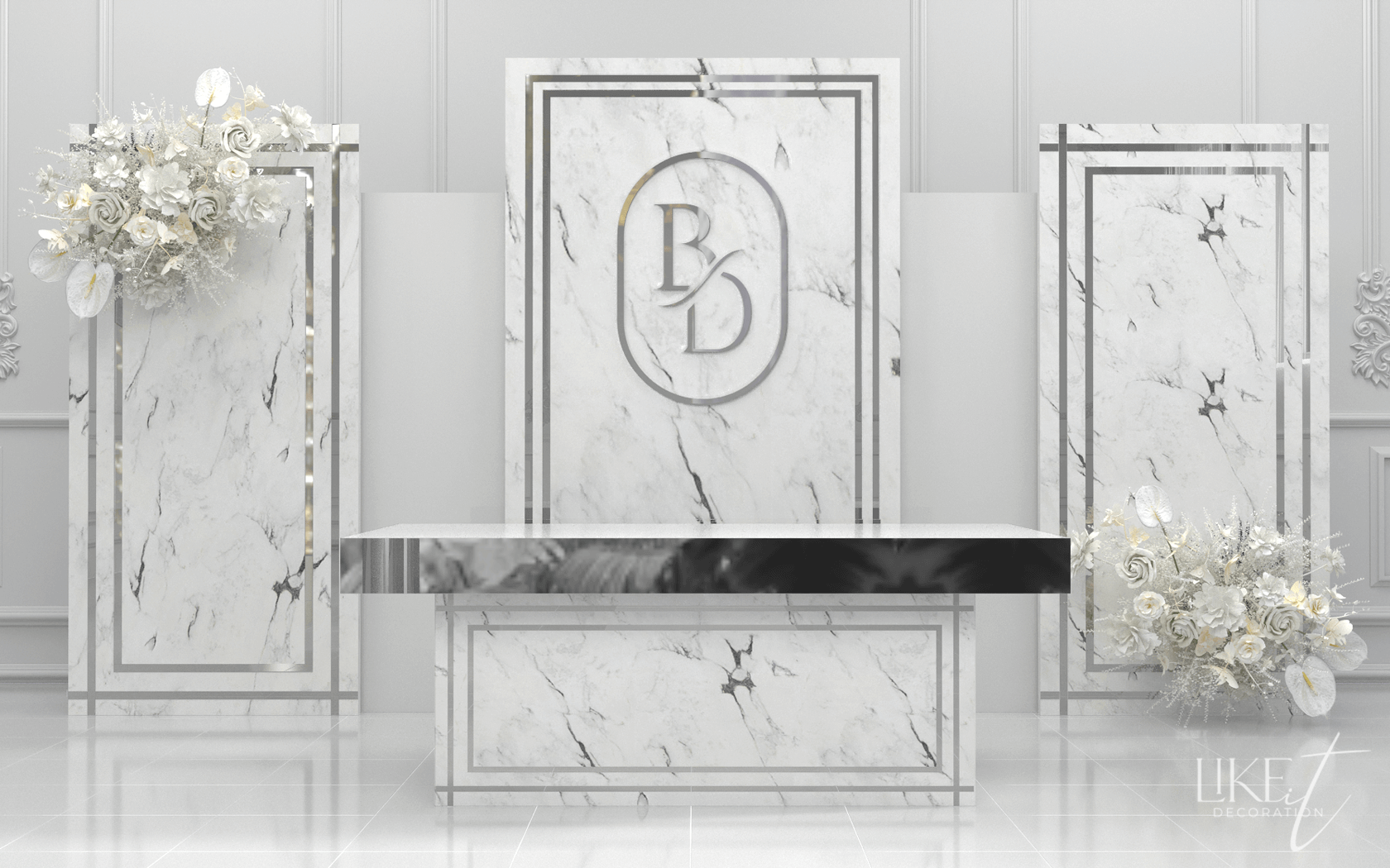 Фон-задник из металлических стоек с печатью, напольные металлические стойки-подсвечники с насыпными свечами, подиум.