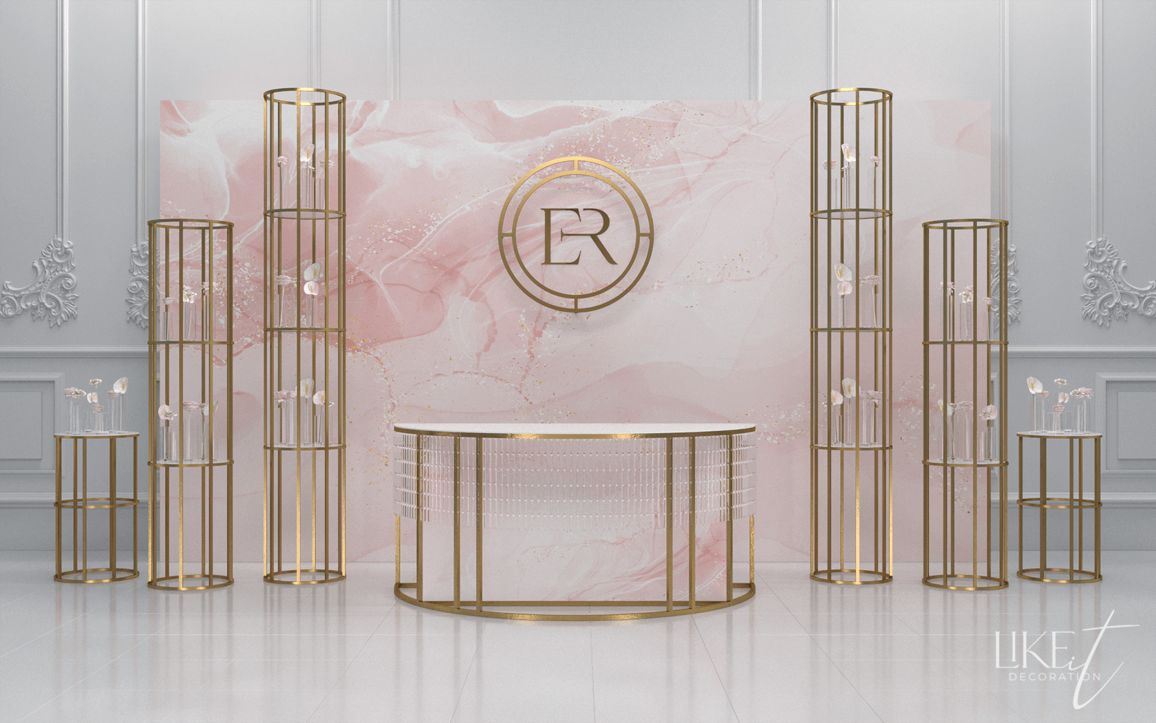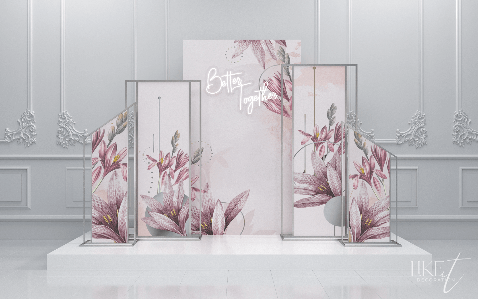 Фон-задник из разноуровневого каркаса с печатью, неоновая вывеска, пластик с печатью на пол, кресло, цветочные композиции из искусственных цветов.