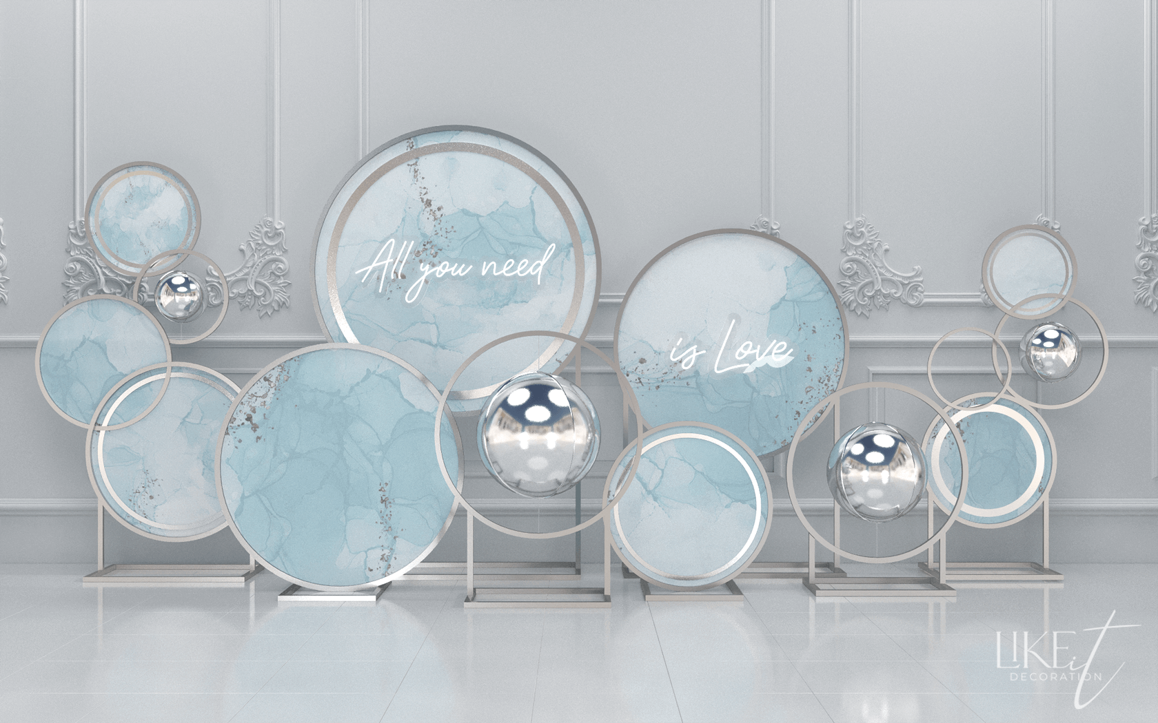 Фон-задник из круглой металлической конструкции c печатью, полукруглый стол с вставкой, неоновая вывеска, круглые металлические стойки с печатью и зеркальными шарами-сферами.
