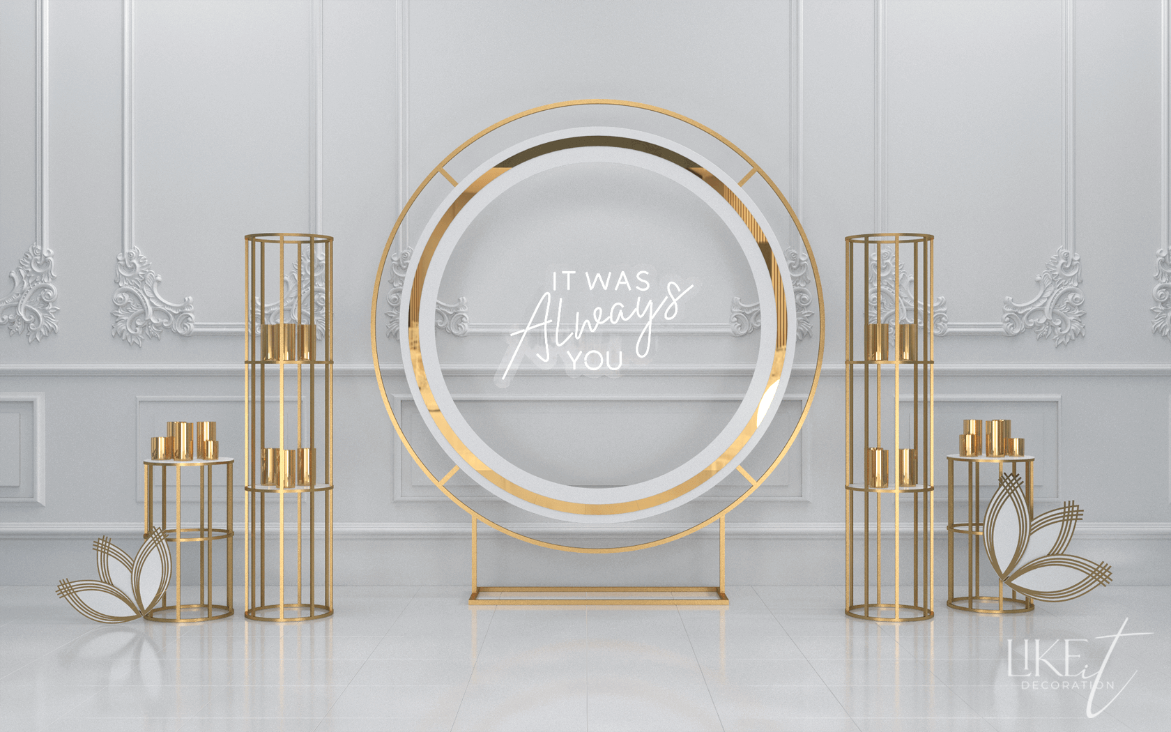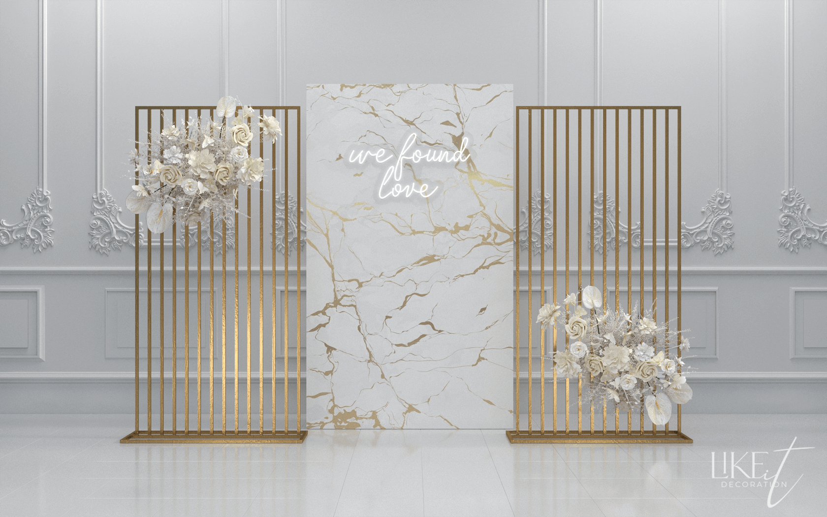 Многоуровневая металлическая стойка с креплением и колбами, живые цветы в колбах, скатерть на круглый стол, салфетка, кольцо для салфетки в стилистике, стул Кьявари.