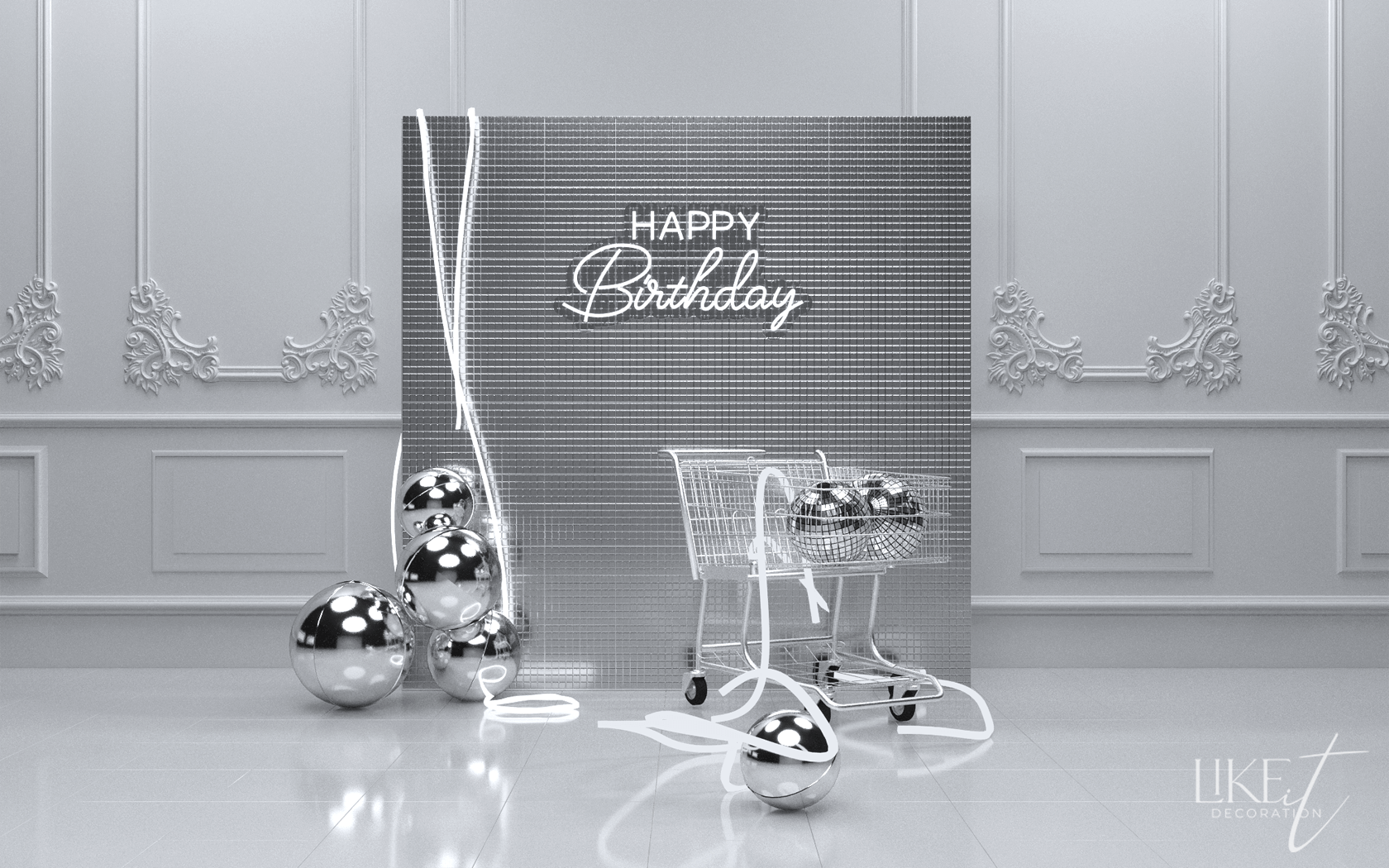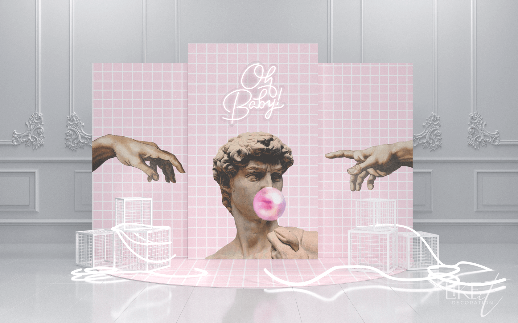 Фон-задник из разноуровневого каркаса с печатью и неоновой подсветкой, неоновая вывеска, пластик с печатью на пол, дизайнерский стул, цветочные композиции из искусственных цветов.